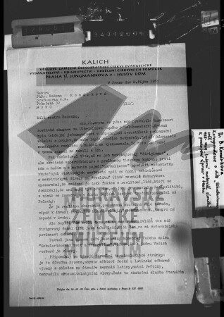 Dopis z vydavatelství Českobratrské církve evangelické Kalich adresovaný Boženě Komárkové, korespondence o jejím díle Sekularizovaný svět a evangelium, říjen 1968.
