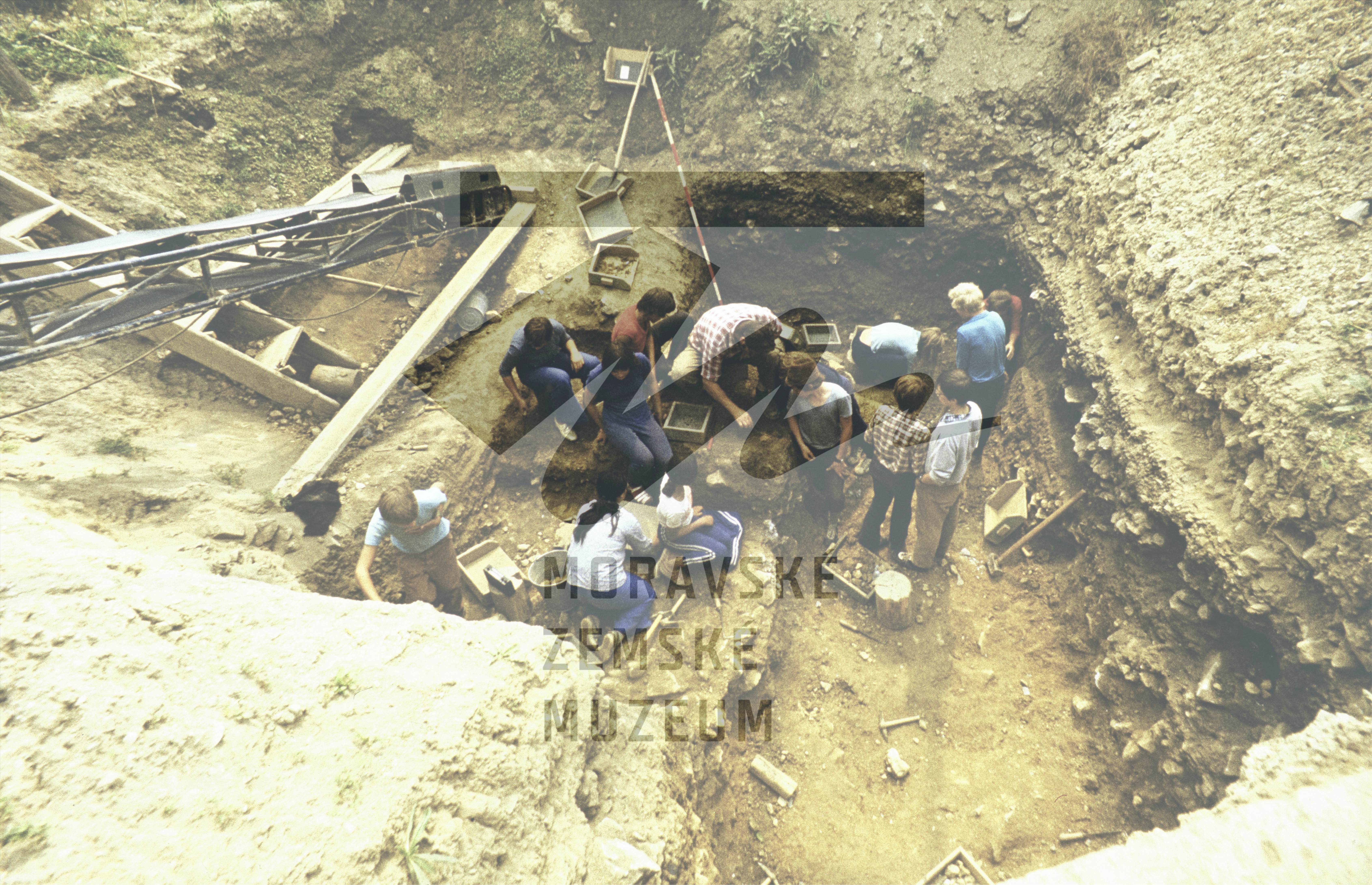 Výzkum v předpolí jeskyně (jižní portál); předkloněný v kostkované košili Vilém Gebauer. Diapozitiv, 1976.