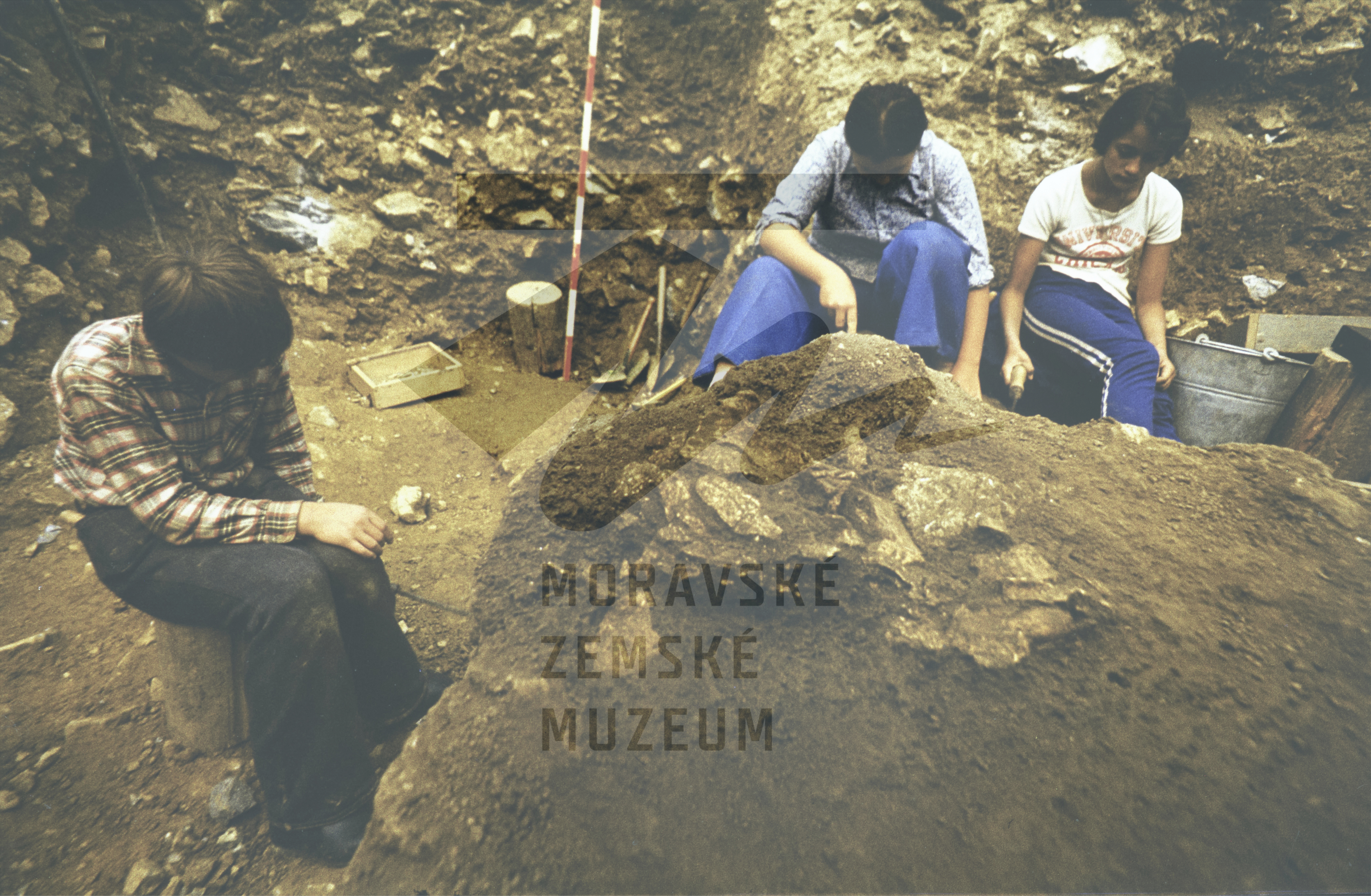 Výzkum v předpolí jeskyně (jižní portál). Diapozitiv 1976.