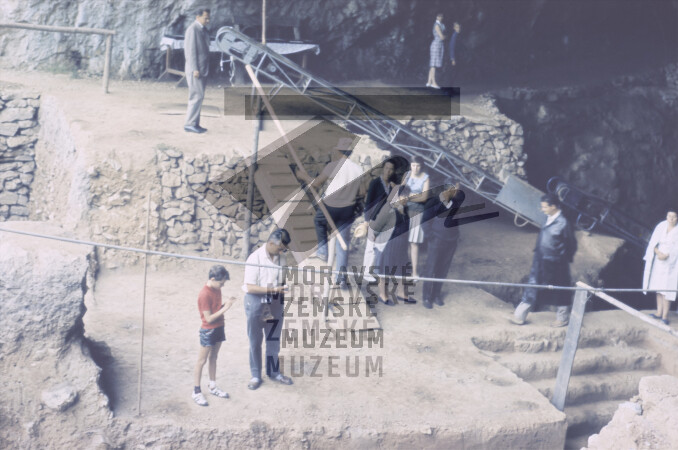 Kongres UISPP 1966 exkurze, nahoře K. Valoch (v šedém obleku), dole s bílým kloboukem R. Naugier. Sektor D, jižní vchod. Diapozitiv.