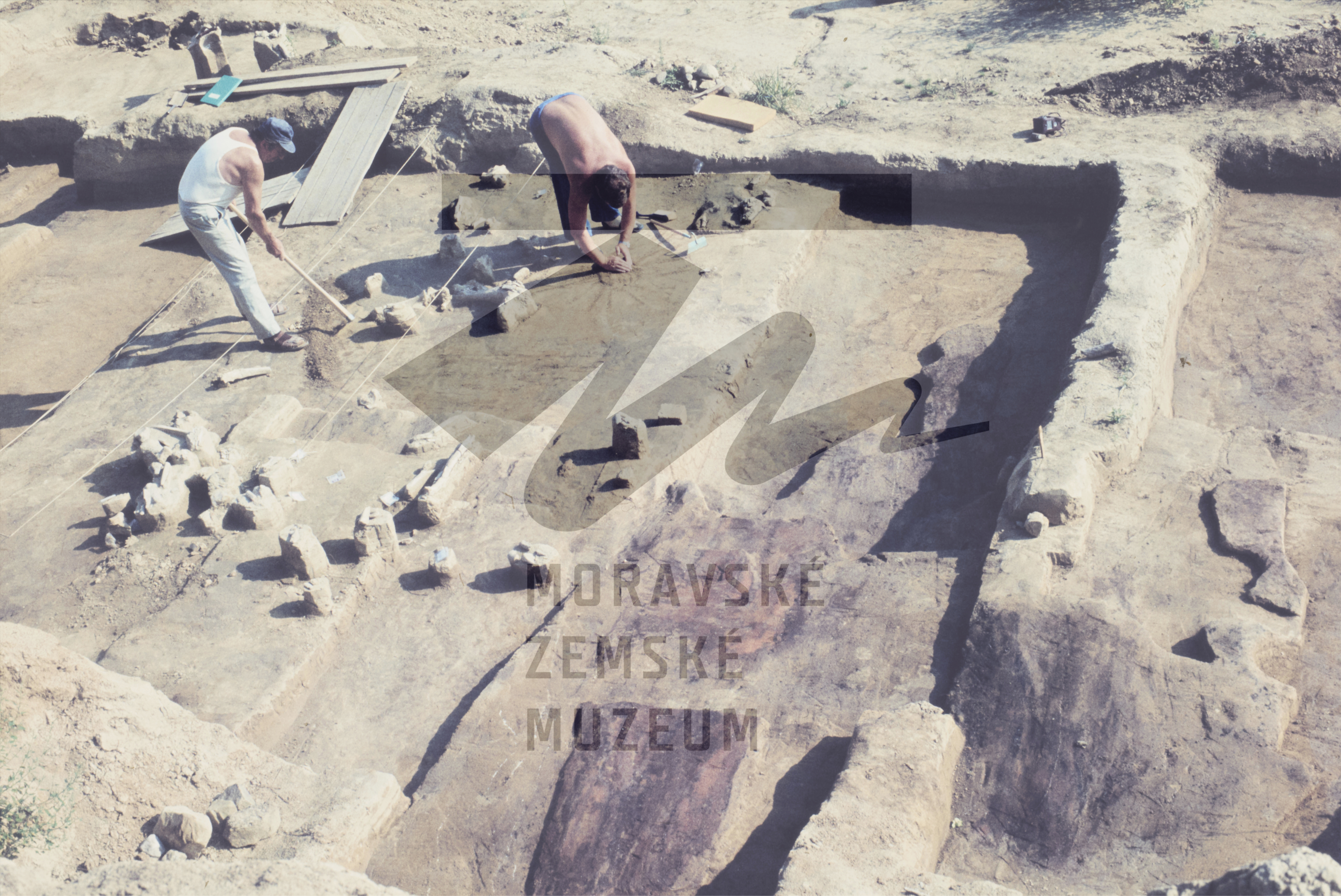 Preparování kulturní vrstvy. Tmavé plochy v popředí vpravo - ohnistě z horizontu aurignacienu.
