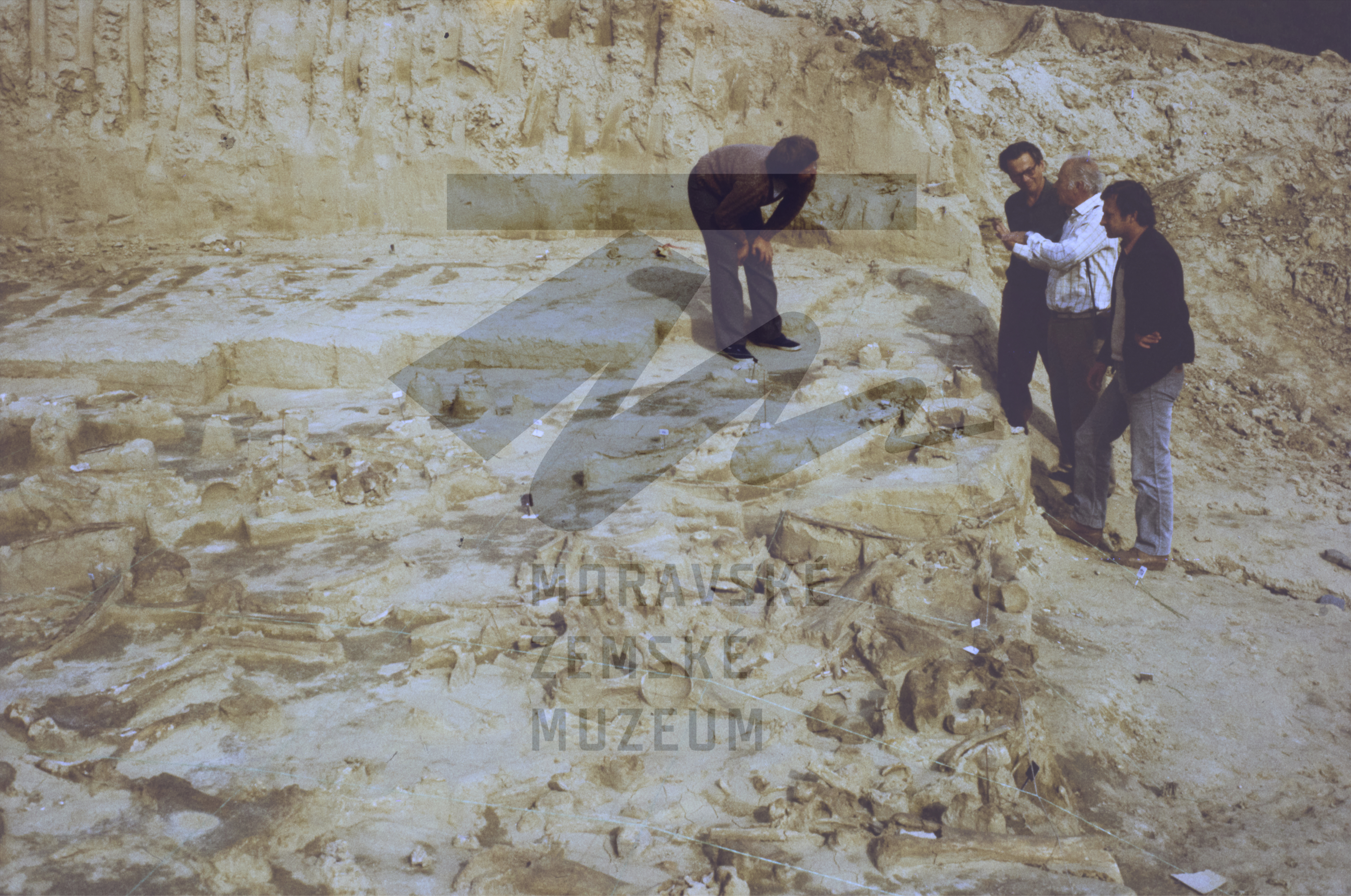 Diskuse nad kulturní vrstvou gravettienu. Zleva: L. Seitl, K. Valoch, R. Musil a A. Otta.