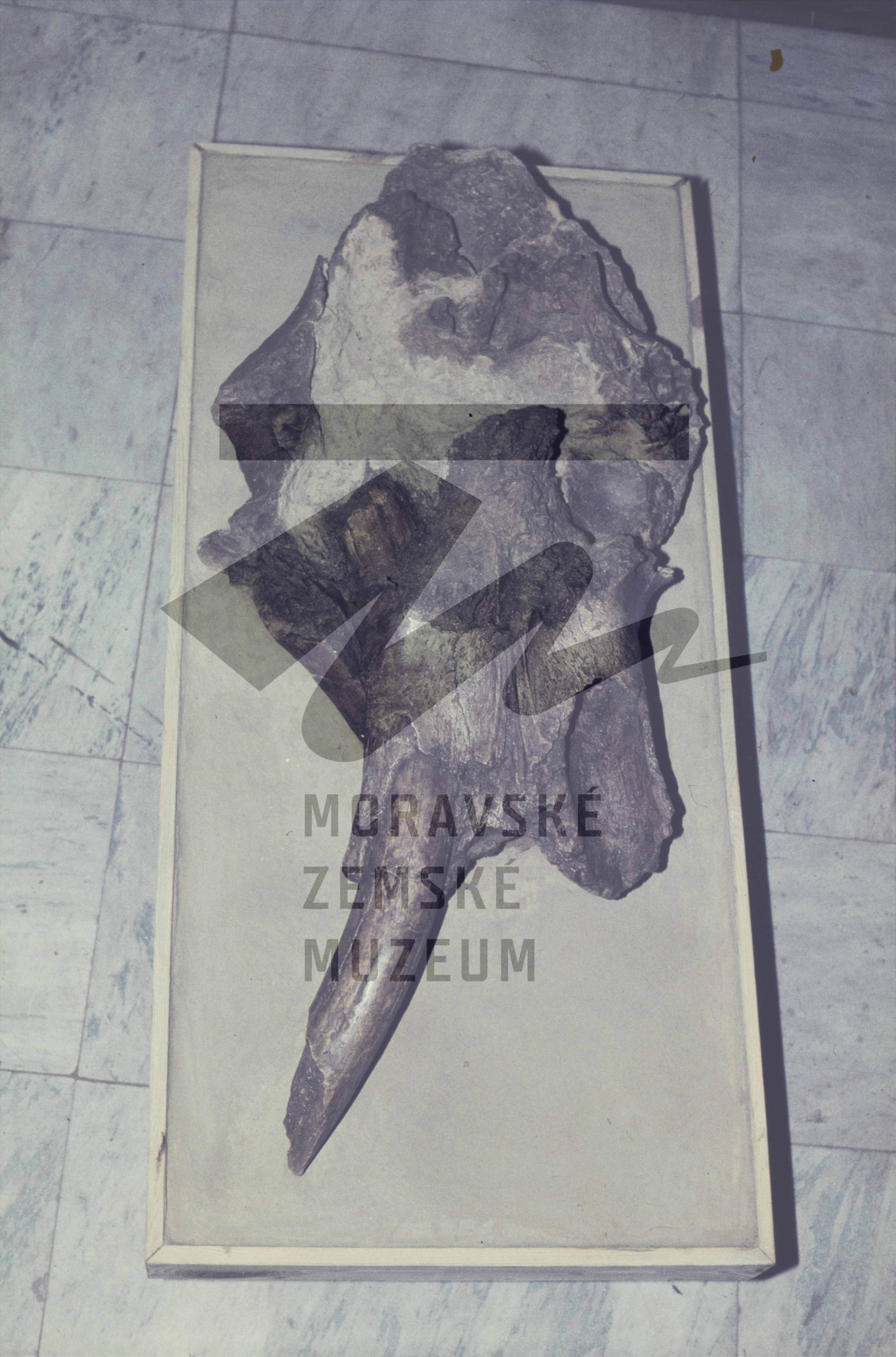 Vyzvednutá mamutí lebka s jedním klem.