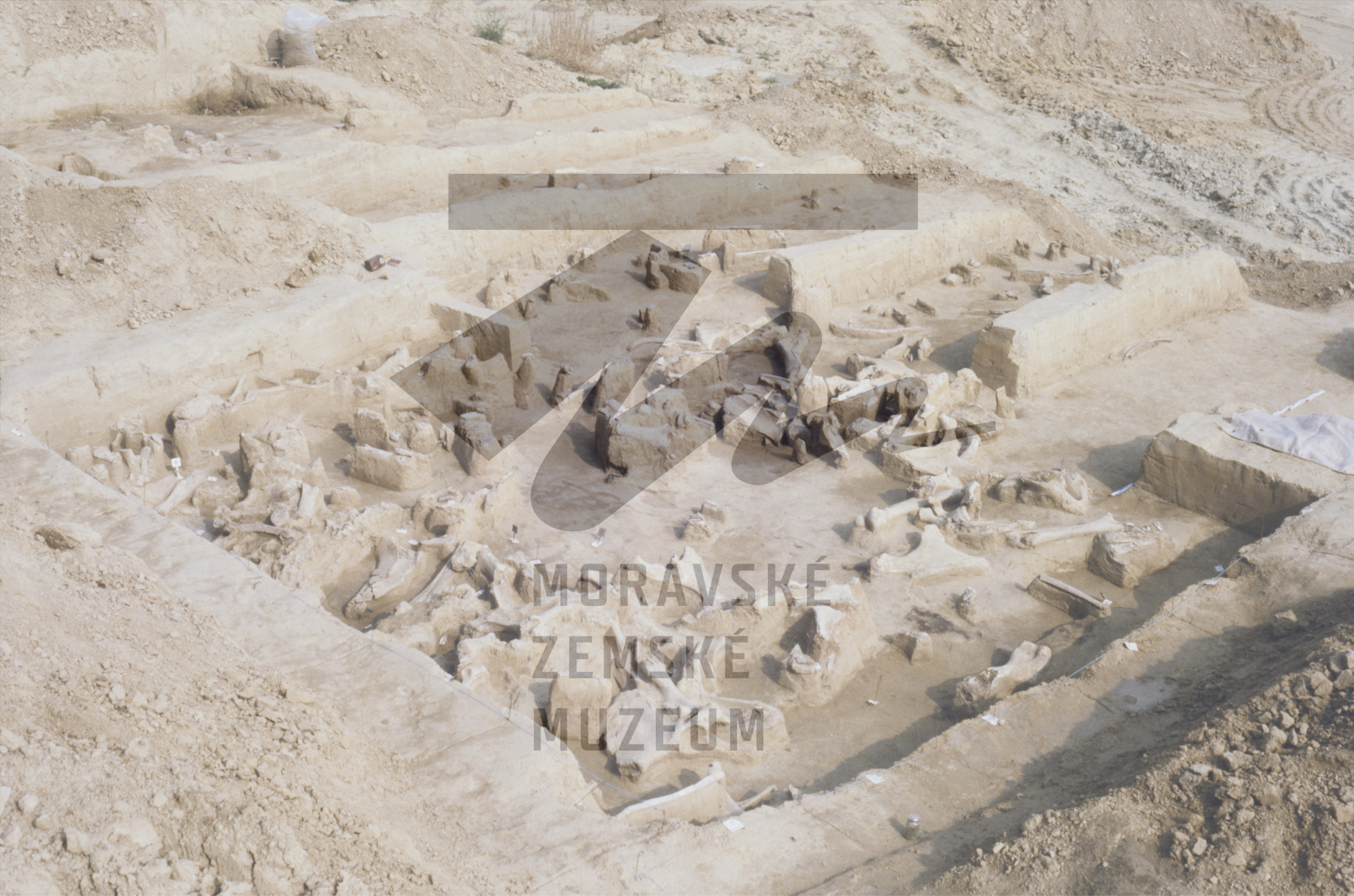 Akumulace mamutích kostí v gravettienské kulturní vrstvě.