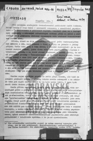 Strojopis práce Jana Tesaře s názvem Diagnóza 301.7, která kolovala v samizdatu od dubna 1979.